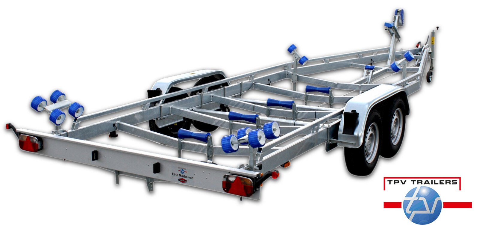 Stahlblechkotflügel, Stecker, 13-polig, 6 höhenverstellbare V-Rollen aus blauem Polyvinyl, Vorne 2 Langauflagen 300 x 92 mm aus blauem Polyvinyl, Hinten 4 Kurbelstützen, vorne 2 Klemmstützen 600mm (höhenverstellbar), Hinten 2 Langauflagen 600 x 92 mm aus blauem Polyvinyl
